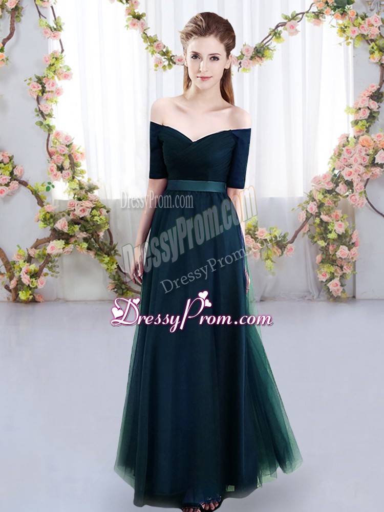 Neckline : Off the shoulder Shown Color : Navy Blue Silhouette : Empire Sleeve Length : short sleeves Hemline : floor length Back Detail : Lace up Fabric : Tulle Embellishment : Ruching Occasion : Prom,Party,Wedding Party Season : Spring,Summer,Fall,Winter