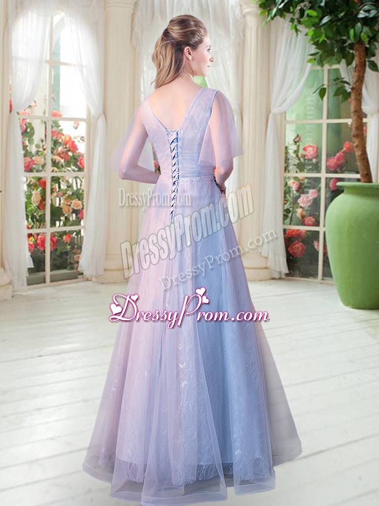 Neckline : V-neckShown Color : GreySilhouette : A-lineSleeve Length : short sleevesHemline : floor lengthBack Detail : Lace upFabric : TulleEmbellishment : AppliquesOccasion : Prom,PartySeason : Spring,Summer,Fall,Winter