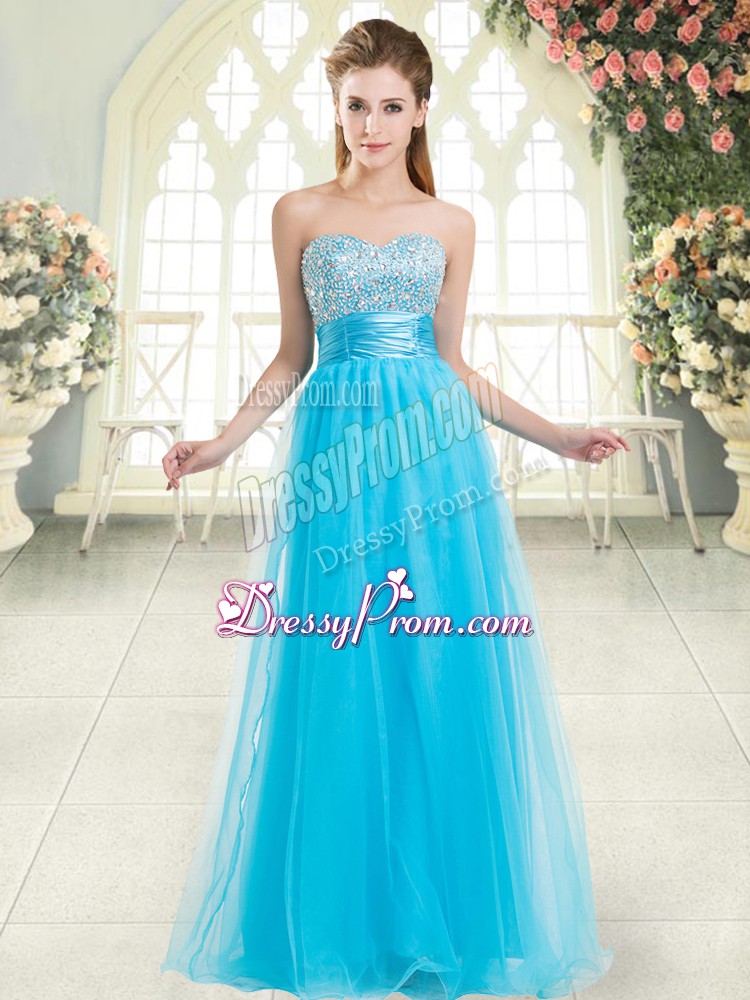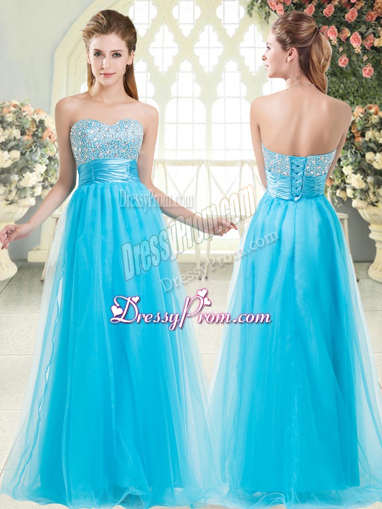 Neckline : SweetheartShown Color : Aqua BlueSilhouette : A-lineSleeve Length : sleevelessHemline : floor lengthBack Detail : Lace upFabric : TulleEmbellishment : BeadingOccasion : Prom,PartySeason : Spring,Summer,Fall,Winter