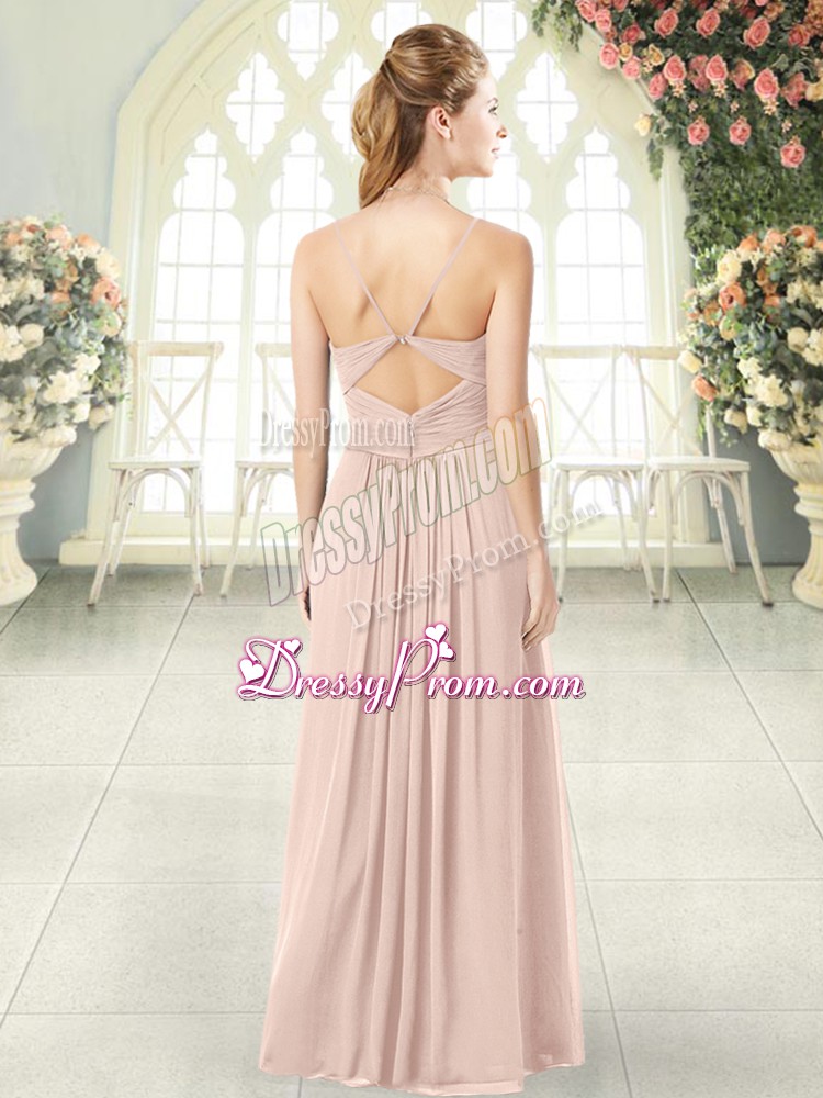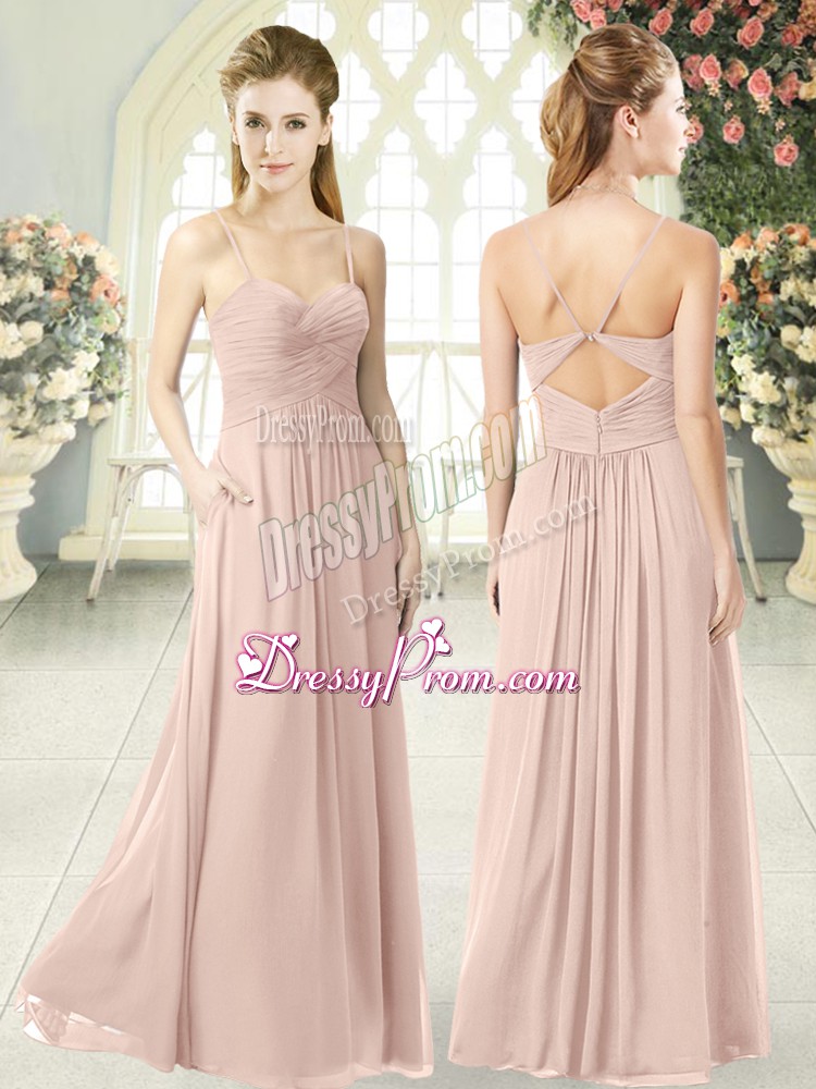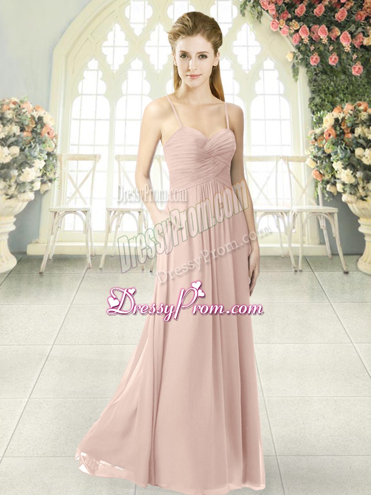 Spaghetti Straps Sleeveless Prom Party Dress Floor Length Ruching Pink Chiffon