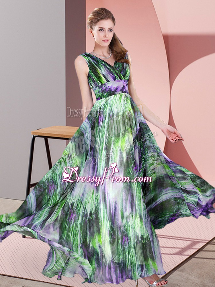 Empire Homecoming Dress Multi-color V-neck Printed Sleeveless Floor Length Lace Up