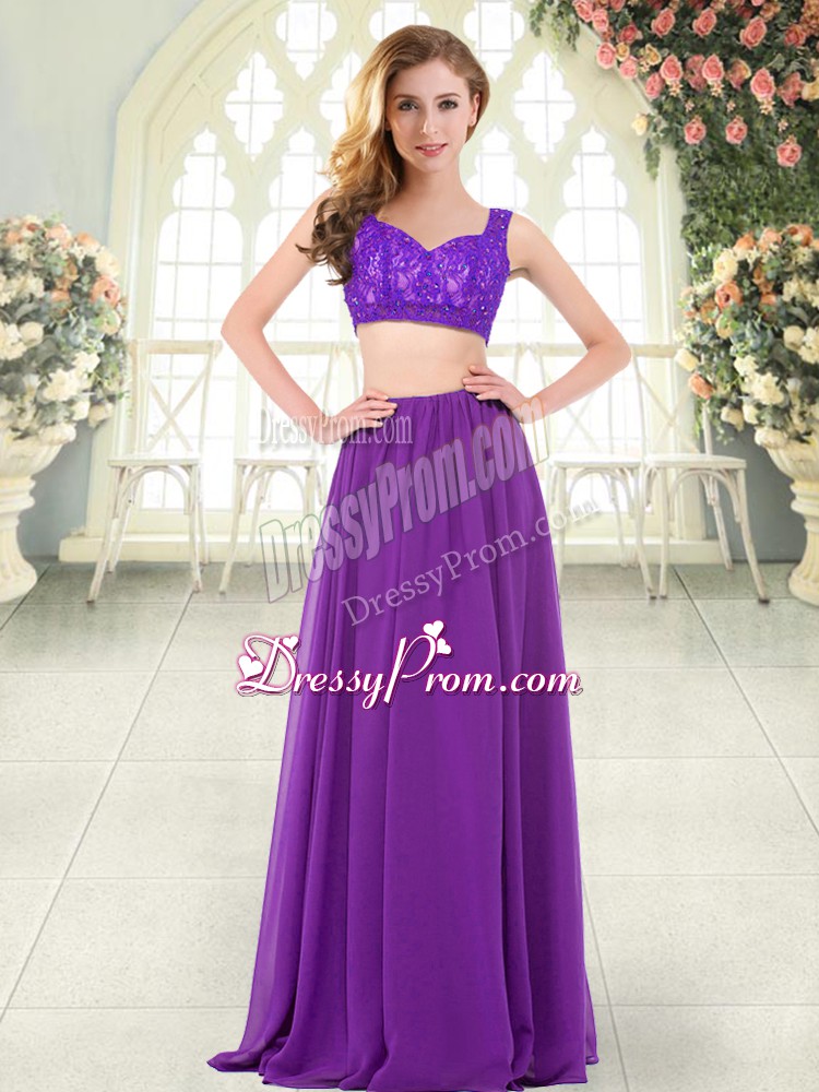 Neckline : StrapsShown Color : PurpleSilhouette : Two PiecesSleeve Length : sleevelessHemline : floor lengthBack Detail : ZipperFabric : ChiffonEmbellishment : Beading,LaceOccasion : Prom,PartySeason : Spring,Summer,Fall,Winter