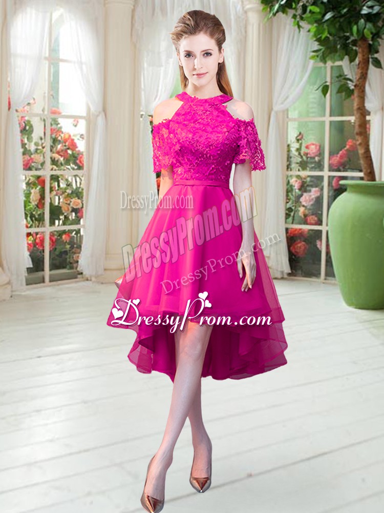Neckline : High-neckShown Color : Hot PinkSilhouette : A-lineSleeve Length : short sleevesHemline : high lowBack Detail : ZipperFabric : TulleEmbellishment : LaceOccasion : Prom,PartySeason : Spring,Summer,Fall