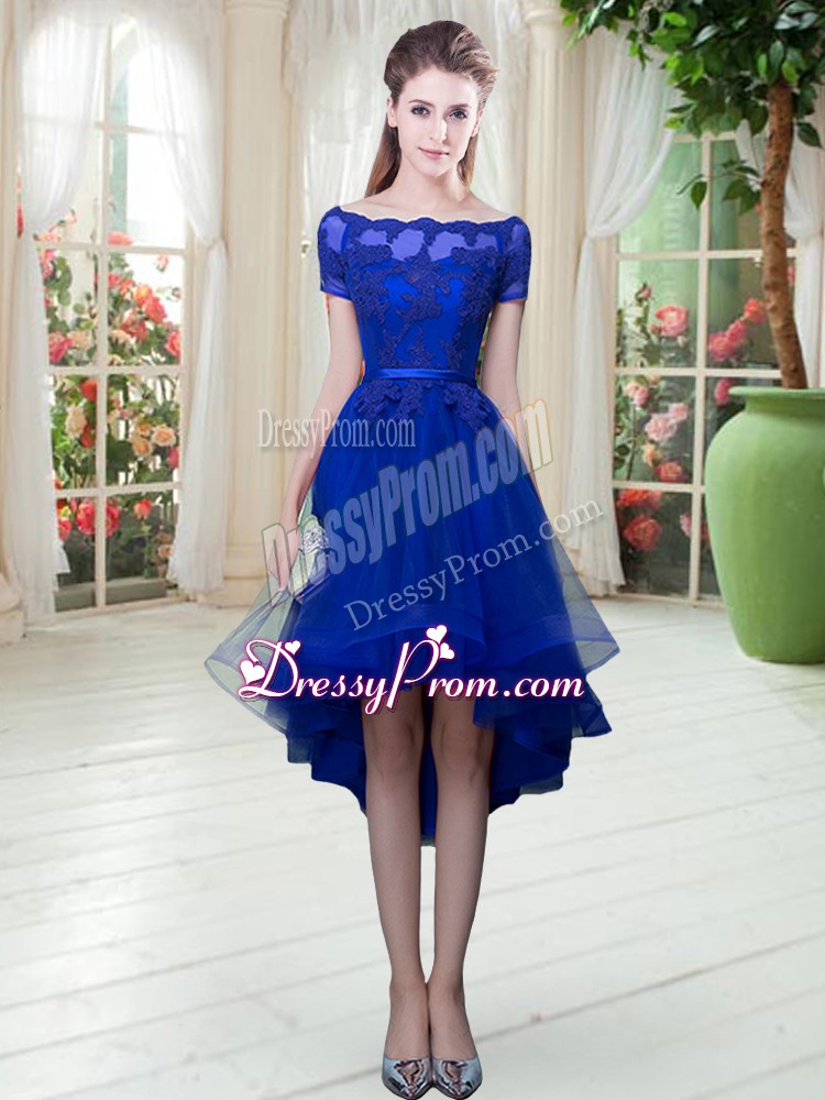 Neckline : Off the shoulder Shown Color : Royal Blue Silhouette : A-line Sleeve Length : short sleeves Hemline : high low Back Detail : Lace up Fabric : Tulle Embellishment : Appliques Occasion : Prom,Party Season : Spring,Summer,Fall,Winter