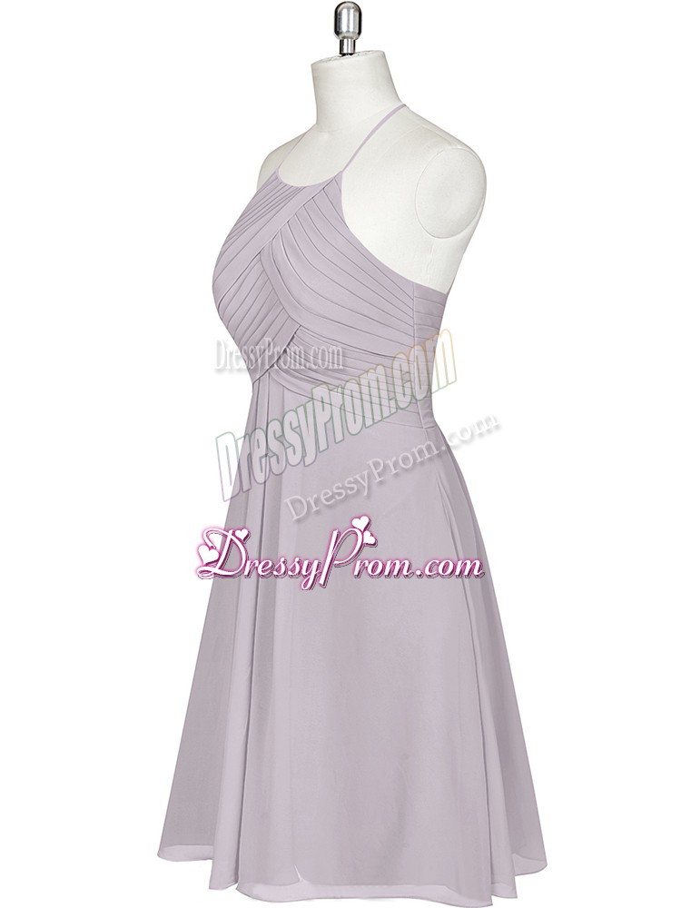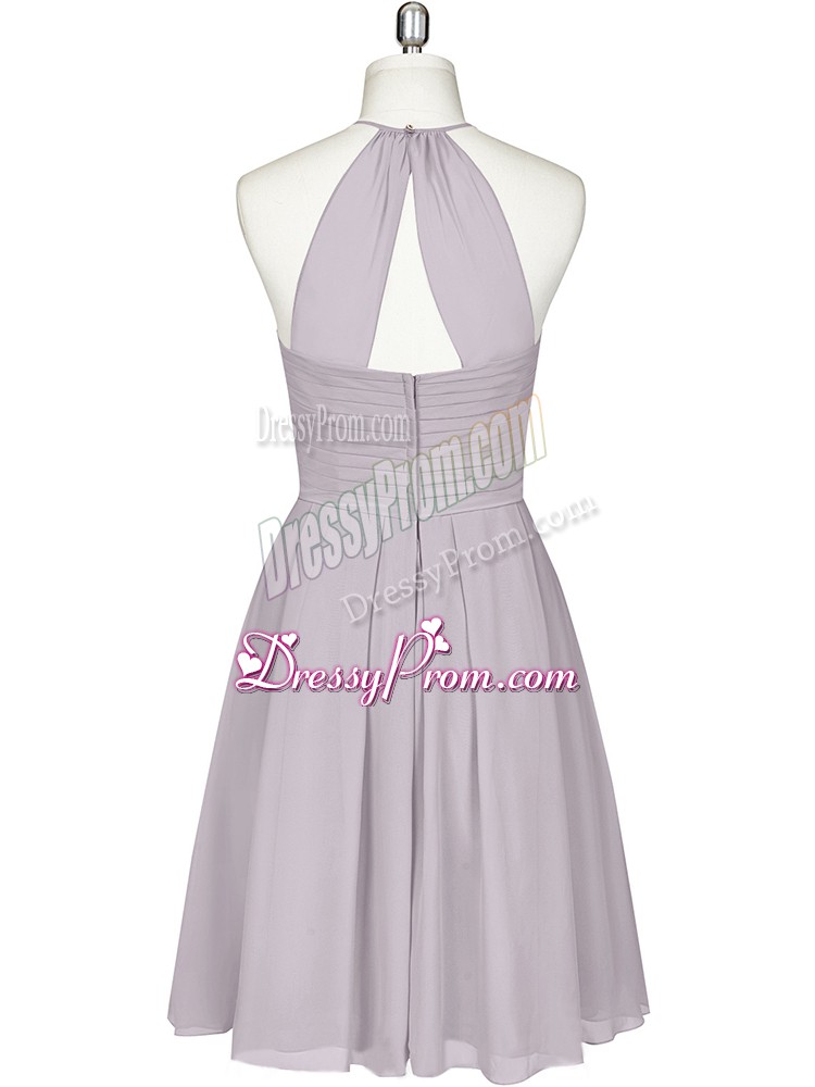 Neckline : Halter topShown Color : GreySilhouette : A-lineSleeve Length : sleevelessHemline : mini lengthBack Detail : ZipperFabric : ChiffonEmbellishment : RuchingOccasion : Prom,PartySeason : Spring,Summer,Fall