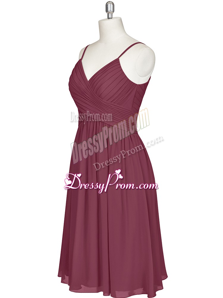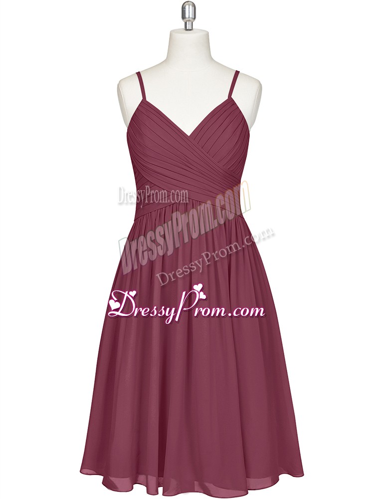 Neckline : Spaghetti strapsShown Color : BurgundySilhouette : A-lineSleeve Length : sleevelessHemline : knee lengthBack Detail : ZipperFabric : ChiffonEmbellishment : PleatedOccasion : Prom,Party,Military BallSeason : Spring,Summer,Fall
