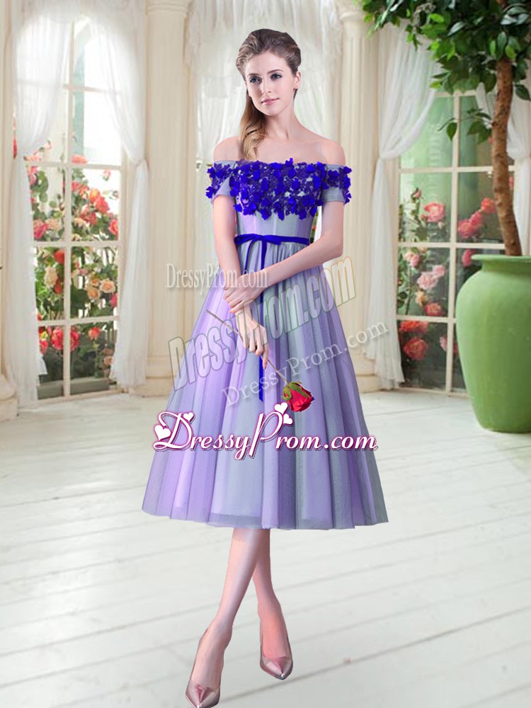 Neckline : Off the shoulderShown Color : LavenderSilhouette : A-lineSleeve Length : sleevelessHemline : tea lengthBack Detail : Lace upFabric : TulleEmbellishment : AppliquesOccasion : Prom,PartySeason : Spring,Summer,Fall,Winter