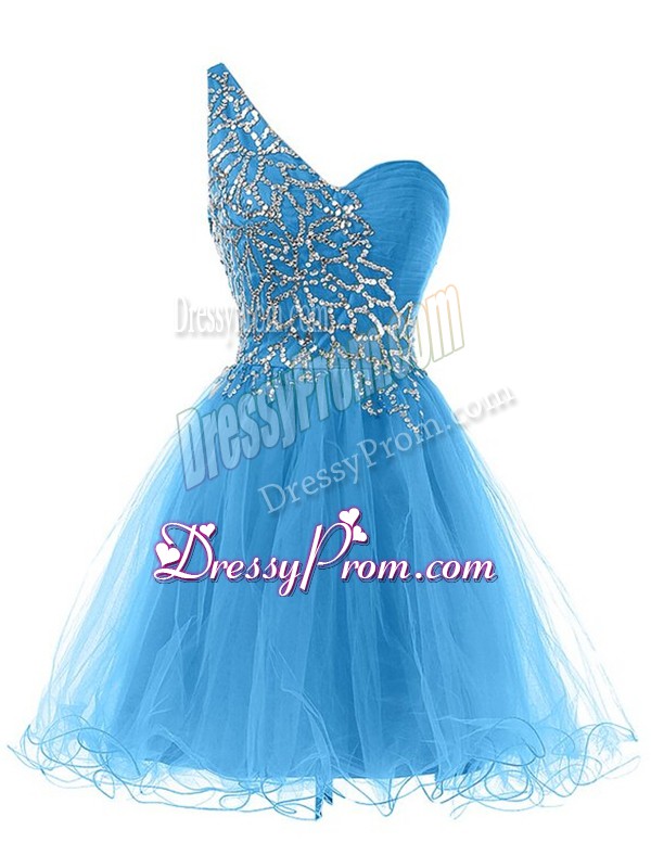 Neckline : One shoulderShown Color : BlueSilhouette : A-lineSleeve Length : sleevelessHemline : mini lengthBack Detail : Lace upFabric : TulleEmbellishment : BeadingOccasion : Prom,Party,Military BallSeason : Spring,Summer,Fall,Winter