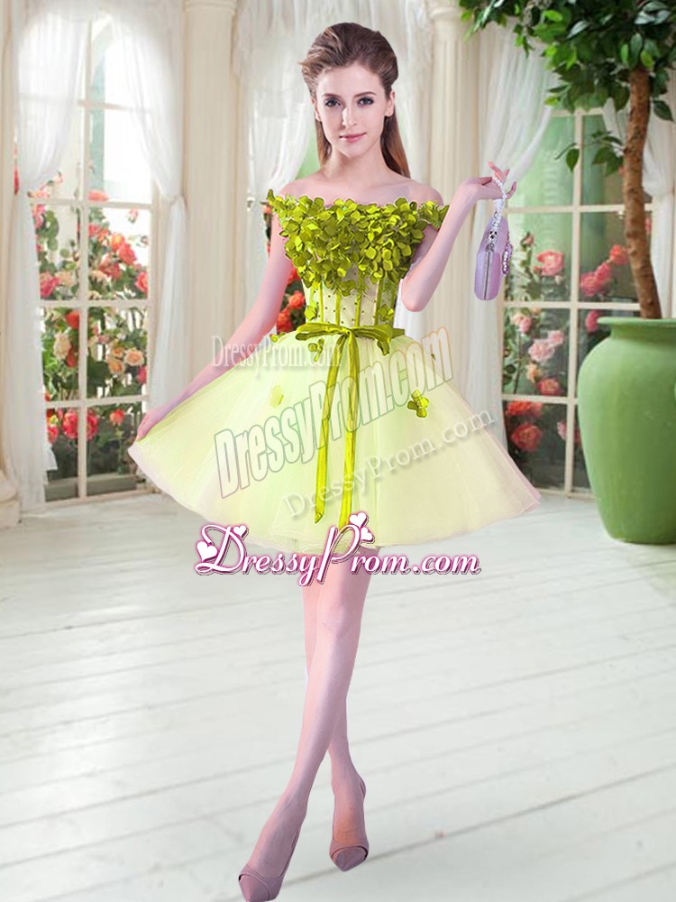 Neckline : Off the shoulder Shown Color : Yellow Green Silhouette : A-line Sleeve Length : sleeveless Hemline : mini length Back Detail : Lace up Fabric : Tulle Embellishment : Beading,Appliques Occasion : Prom,Party Season : Spring,Summer,Fall