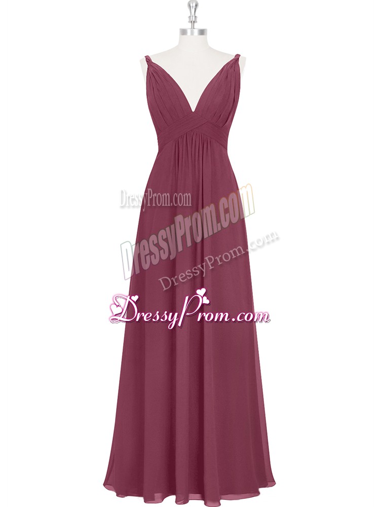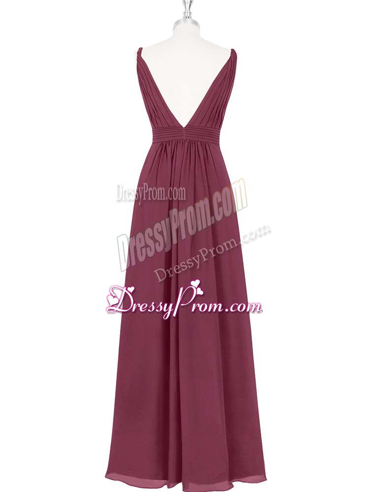 Neckline : V-neckShown Color : BurgundySilhouette : EmpireSleeve Length : sleevelessHemline : floor lengthBack Detail : BacklessFabric : ChiffonEmbellishment : Ruching,PleatedOccasion : Prom,Party,Military BallSeason : Spring,Summer,Fall,Winter