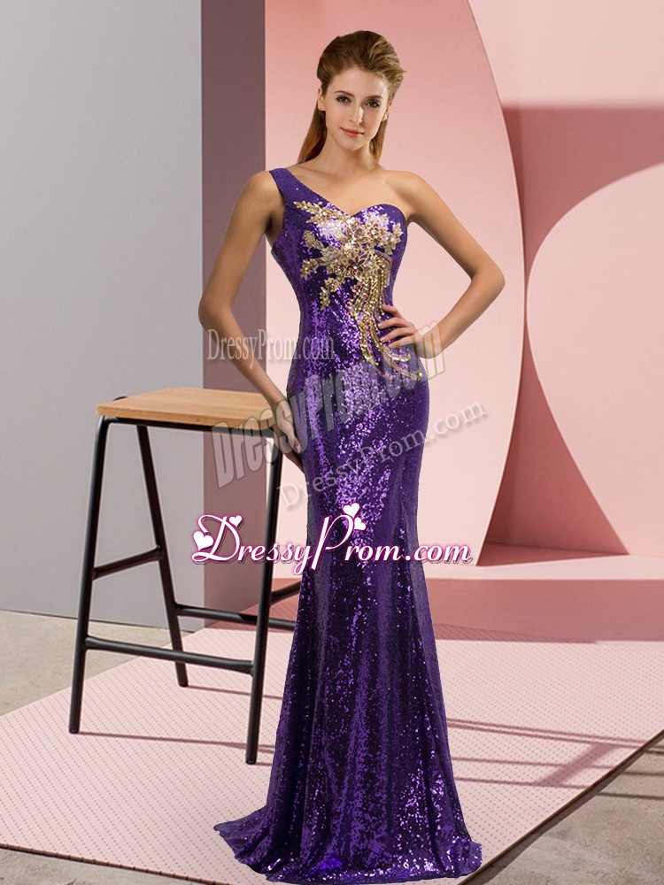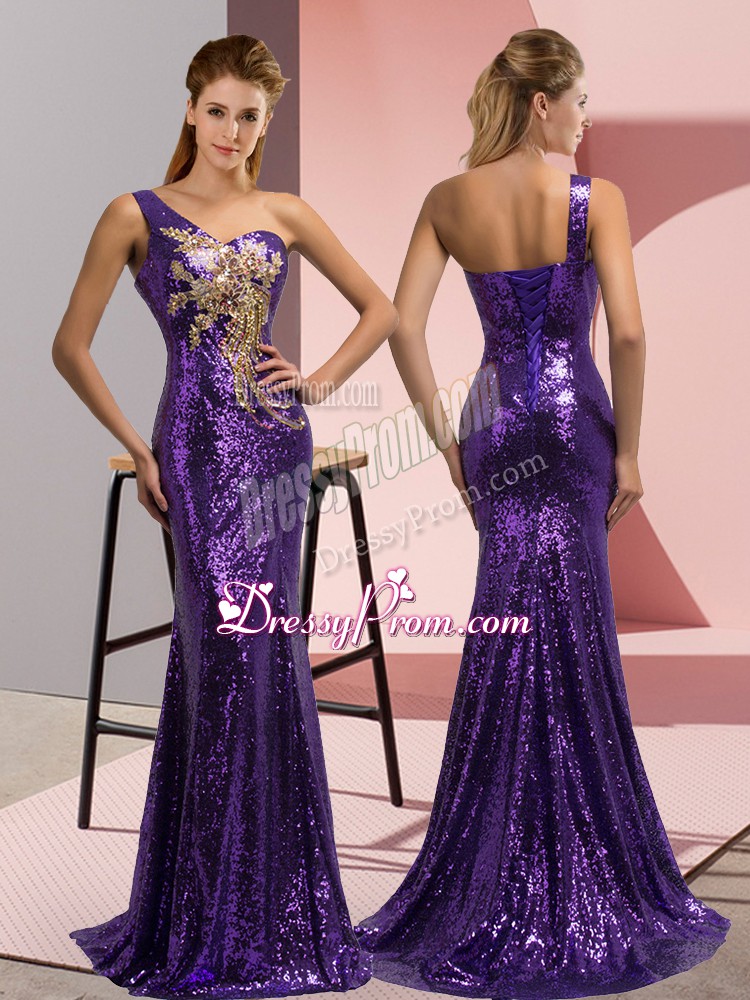 Neckline : One shoulderShown Color : PurpleSilhouette : MermaidSleeve Length : sleevelessBack Detail : Lace upFabric : SequinedEmbellishment : Beading,AppliquesOccasion : Prom,Party,Military BallSeason : Spring,Summer,Fall,Winter
