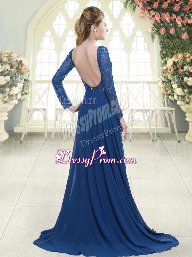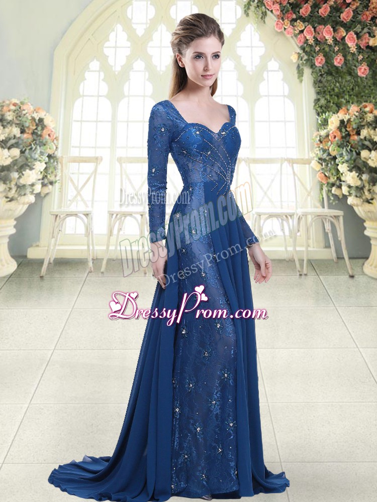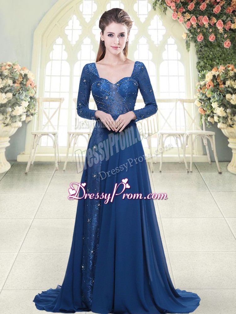 Neckline : SweetheartShown Color : BlueSilhouette : A-lineSleeve Length : long sleevesBack Detail : ZipperFabric : ChiffonEmbellishment : Beading,LaceOccasion : Prom,PartySeason : Spring,Summer,Fall,Winter