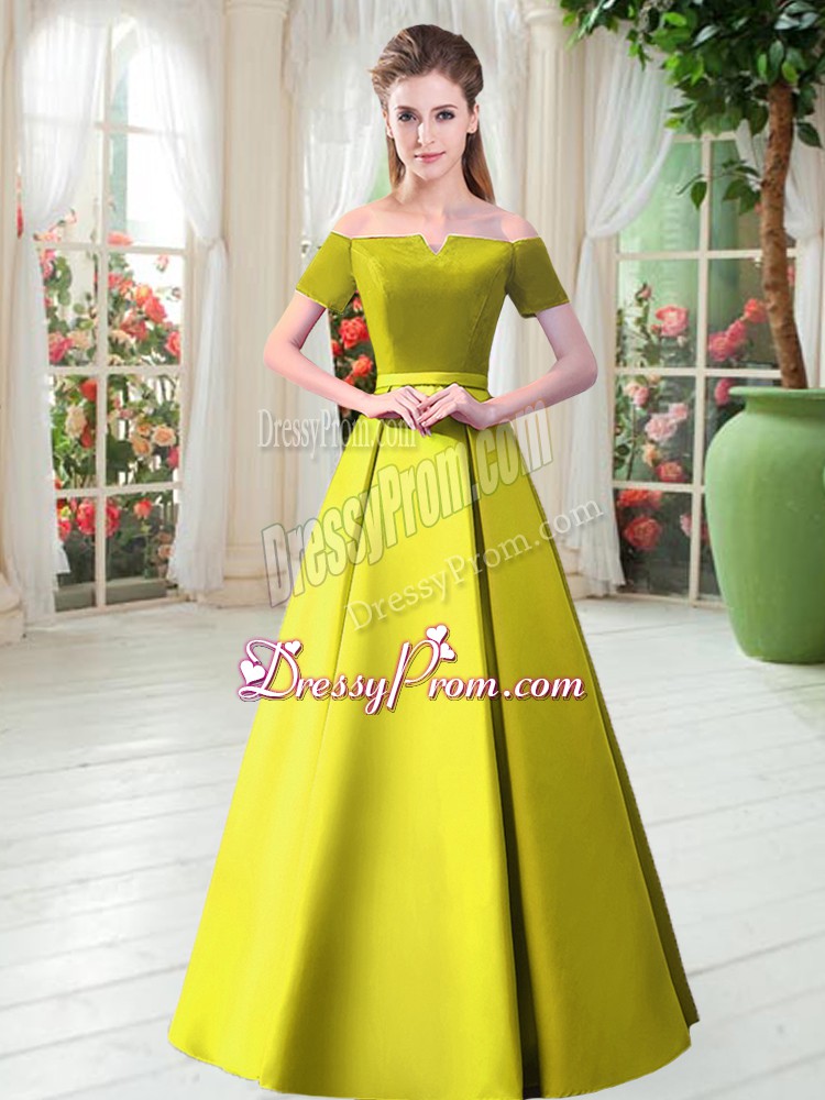 Custom Fit Yellow Green A-line Off The Shoulder Short Sleeves Satin Floor Length Lace Up Belt Homecoming Dress