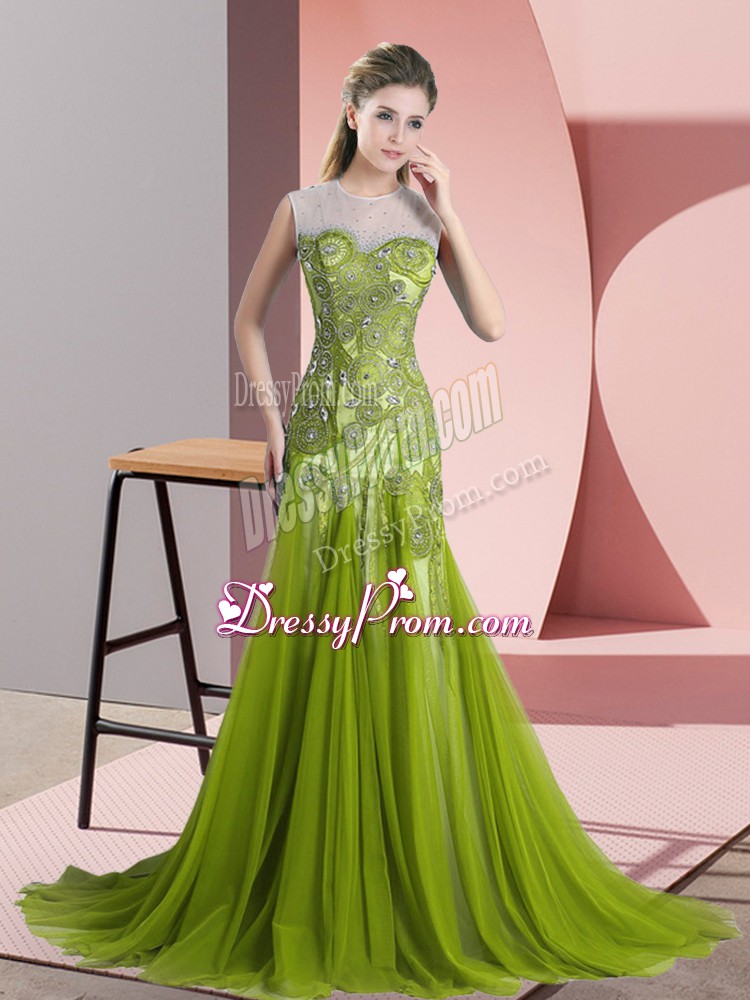 Neckline : ScoopShown Color : Olive GreenSilhouette : A-lineSleeve Length : sleevelessBack Detail : BacklessFabric : TulleEmbellishment : Beading,AppliquesOccasion : Prom,Party,Military BallSeason : Spring,Summer,Fall,Winter