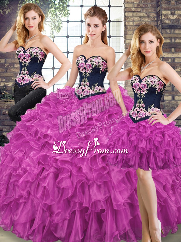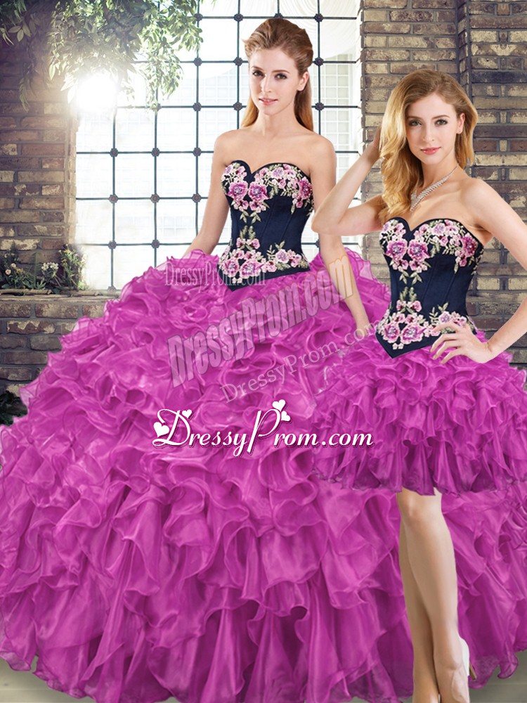 Neckline : SweetheartShown Color : FuchsiaSilhouette : Ball GownsSleeve Length : sleevelessHemline : floor lengthBack Detail : Lace upFabric : OrganzaEmbellishment : Embroidery,RufflesOccasion : Military Ball,Sweet 16,QuinceaneraSeason : Spring,Summer,Fall,Winter
