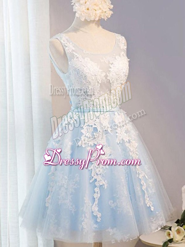 Neckline : ScoopShown Color : Baby BlueSilhouette : A-lineSleeve Length : sleevelessHemline : knee lengthBack Detail : Lace upFabric : TulleEmbellishment : Appliques,BeltOccasion : Prom,PartySeason : Spring,Summer,Fall,Winter