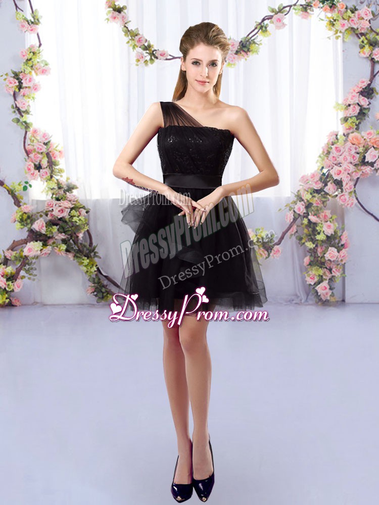 Neckline : One shoulder Shown Color : Black Silhouette : A-line Sleeve Length : sleeveless Hemline : mini length Back Detail : Side zipper Fabric : Tulle Embellishment : Lace Occasion : Prom,Party,Wedding Party Season : Spring,Summer,Fall