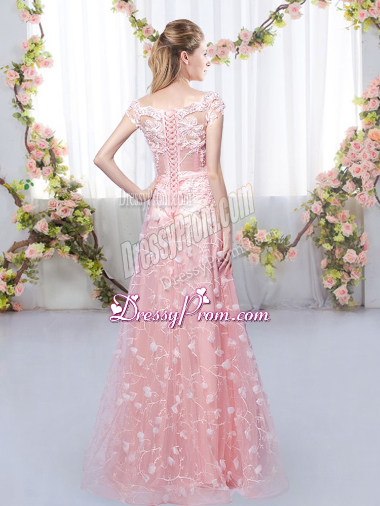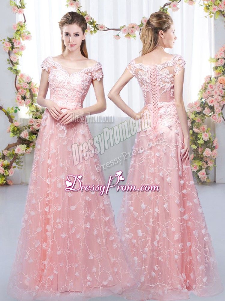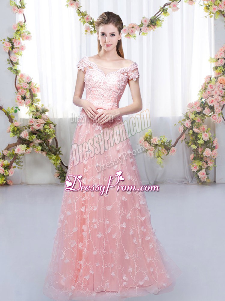 Neckline : Off the shoulder Shown Color : Pink Silhouette : Empire Sleeve Length : cap sleeves Hemline : floor length Back Detail : Lace up Fabric : Tulle Embellishment : Appliques Occasion : Prom,Party,Wedding Party Season : Spring,Summer,Fall,Winter