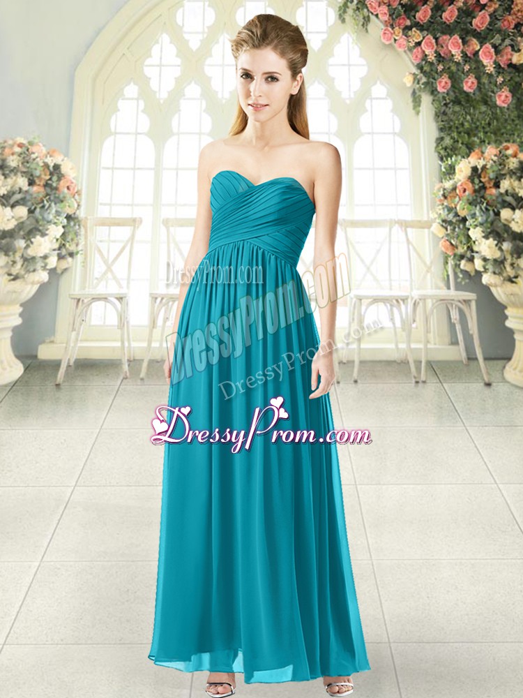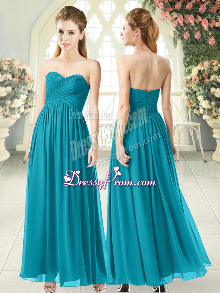 Neckline : SweetheartShown Color : Teal Silhouette : EmpireSleeve Length : sleevelessHemline : ankle lengthBack Detail : ZipperFabric : ChiffonEmbellishment : RuchingOccasion : Prom,PartySeason : Spring,Summer,Fall,Winter