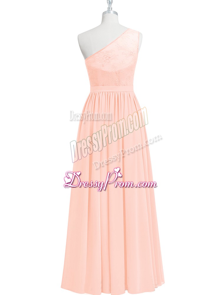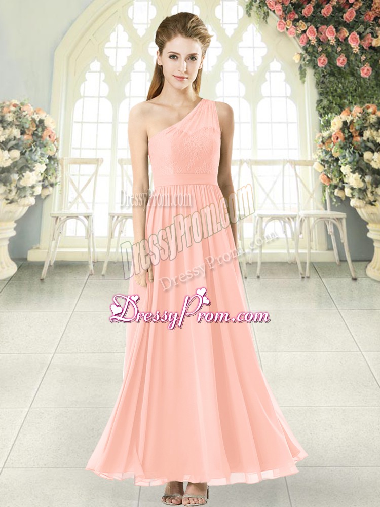 Neckline : One shoulderShown Color : Pink Silhouette : EmpireSleeve Length : sleevelessHemline : ankle lengthBack Detail : Side zipperFabric : ChiffonEmbellishment : LaceOccasion : Prom,PartySeason : Spring,Summer,Fall,Winter