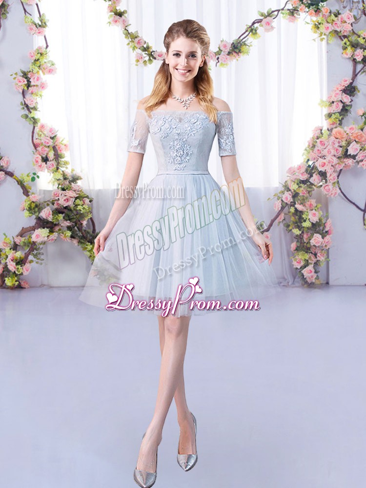 Neckline : Off the shoulder Shown Color : Grey Silhouette : A-line Sleeve Length : short sleeves Hemline : mini length Back Detail : Lace up Fabric : Tulle Embellishment : Lace Occasion : Prom,Party,Wedding Party Season : Spring,Summer,Fall