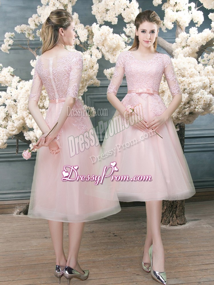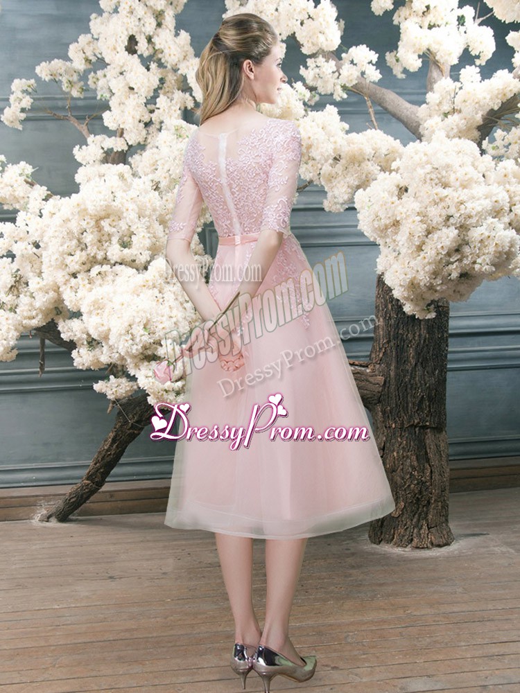 Neckline : ScoopShown Color : Pink Silhouette : A-lineSleeve Length : half sleevesHemline : tea lengthBack Detail : ZipperFabric : TulleEmbellishment : LaceOccasion : Prom,PartySeason : Spring,Summer,Fall,Winter