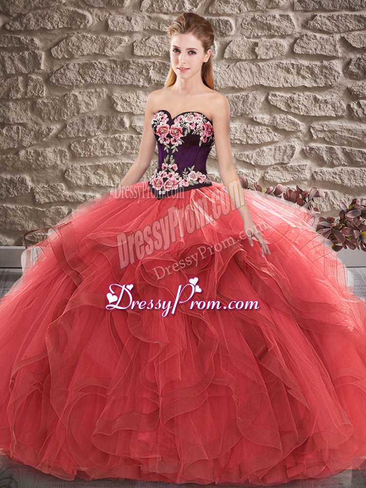 Neckline : SweetheartShown Color : RedSilhouette : Ball GownsSleeve Length : sleevelessHemline : floor lengthBack Detail : Lace upFabric : TulleEmbellishment : Beading,EmbroideryOccasion : Sweet 16,QuinceaneraSeason : Spring,Summer,Fall,Winter