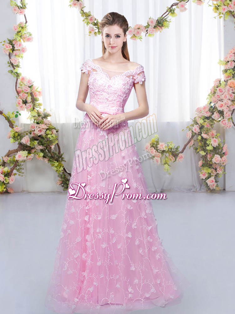 Off The Shoulder Cap Sleeves Quinceanera Dama Dress Floor Length Appliques Rose Pink Tulle