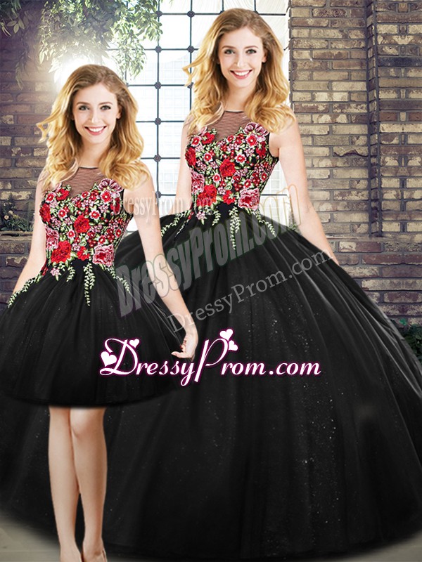 Neckline : ScoopShown Color : BlackSilhouette : Ball GownsSleeve Length : sleevelessHemline : floor lengthBack Detail : ZipperFabric : TulleEmbellishment : EmbroideryOccasion : Military Ball,Sweet 16,QuinceaneraSeason : Spring,Summer,Fall,Winter
