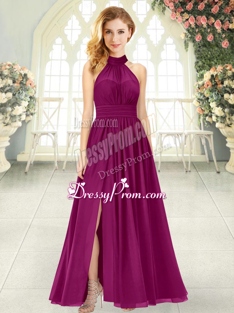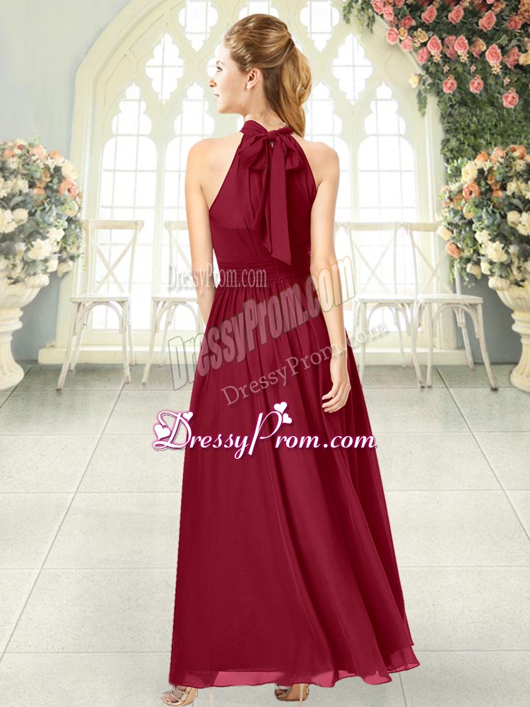 Neckline : Halter topShown Color : BurgundySilhouette : EmpireSleeve Length : sleevelessHemline : ankle lengthBack Detail : ZipperFabric : ChiffonEmbellishment : RuchingOccasion : Prom,PartySeason : Spring,Summer,Fall,Winter