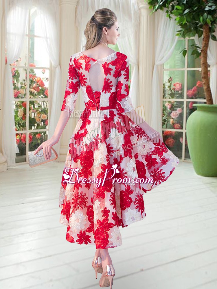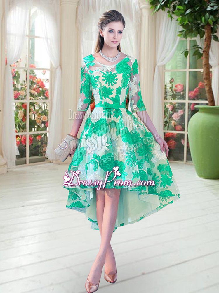 Neckline : ScoopShown Color : TurquoiseSilhouette : A-lineSleeve Length : half sleevesHemline : high lowBack Detail : Lace upFabric : LaceEmbellishment : BeltOccasion : Prom,PartySeason : Spring,Summer,Fall,Winter