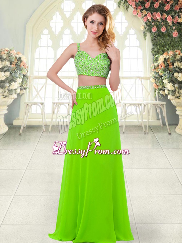 Neckline : StrapsShown Color : Spring GreenSilhouette : Two PiecesSleeve Length : sleevelessHemline : floor lengthBack Detail : ZipperFabric : ChiffonEmbellishment : BeadingOccasion : Prom,PartySeason : Spring,Summer,Fall,Winter