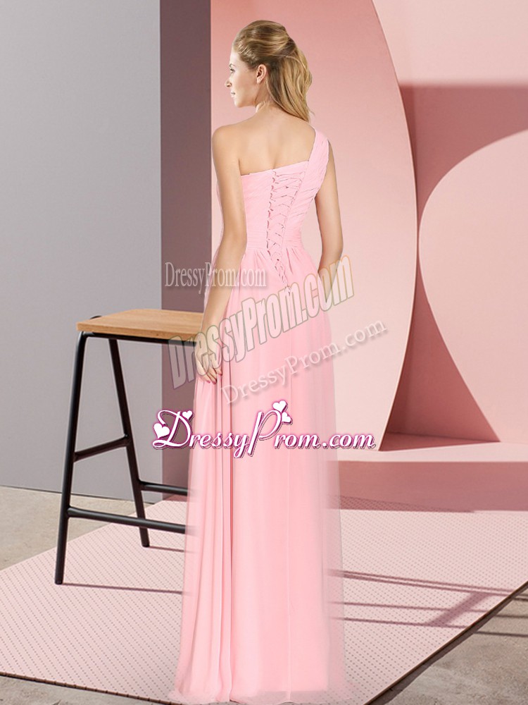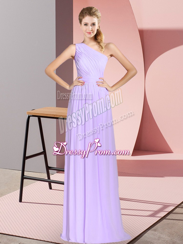 Neckline : One shoulderShown Color : LavenderSilhouette : EmpireSleeve Length : sleevelessHemline : floor lengthBack Detail : Lace upFabric : ChiffonEmbellishment : RuchingOccasion : Prom,PartySeason : Spring,Summer,Fall,Winter