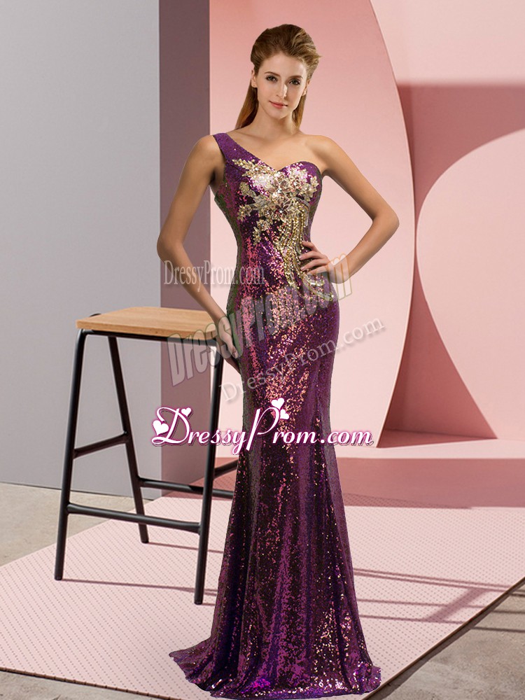 Neckline : One shoulderShown Color : PurpleSilhouette : MermaidSleeve Length : sleevelessBack Detail : Lace upFabric : SequinedEmbellishment : Beading,AppliquesOccasion : Prom,Party,Military BallSeason : Spring,Summer,Fall,Winter