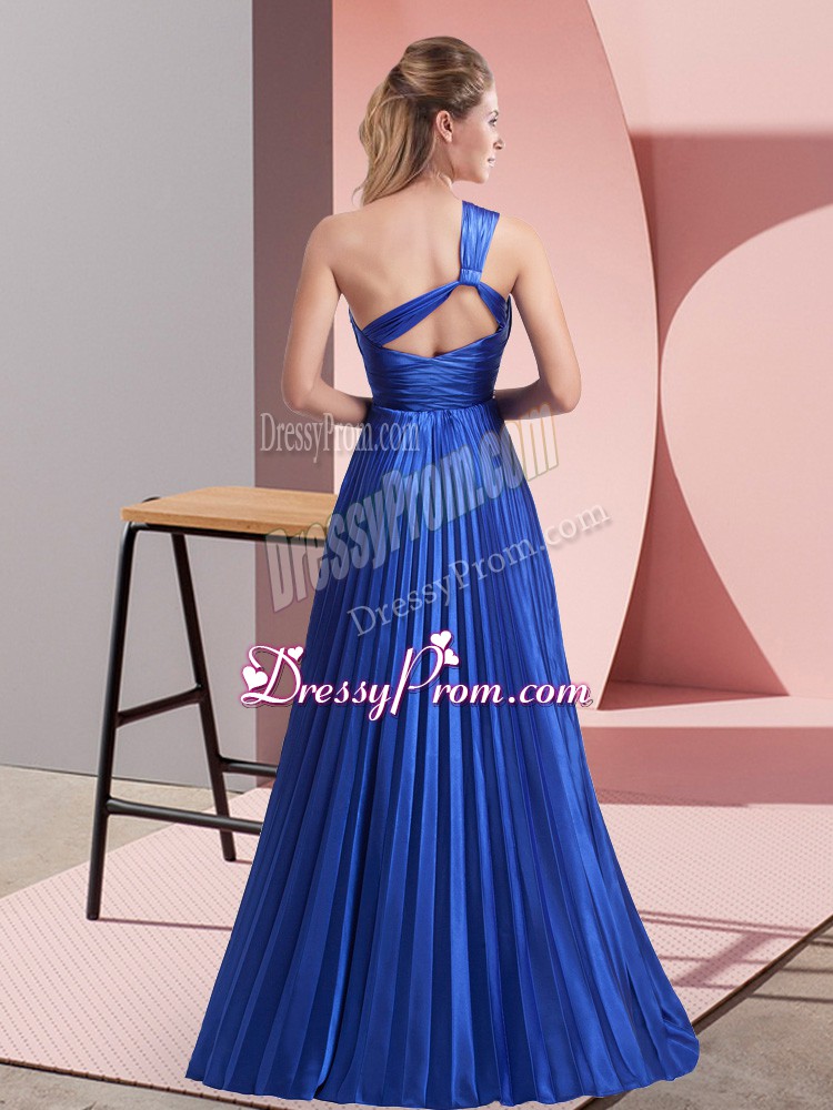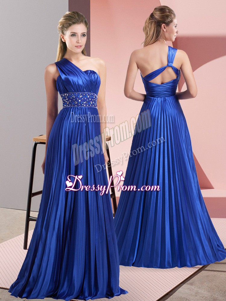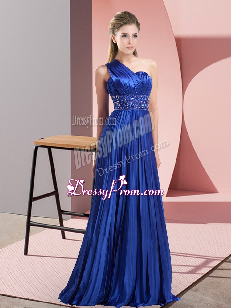 Neckline : One shoulderShown Color : Royal BlueSilhouette : EmpireSleeve Length : sleevelessHemline : floor lengthBack Detail : BacklessFabric : ChiffonEmbellishment : Beading,RuchingOccasion : Prom,Party,Military BallSeason : Spring,Summer,Fall,Winter