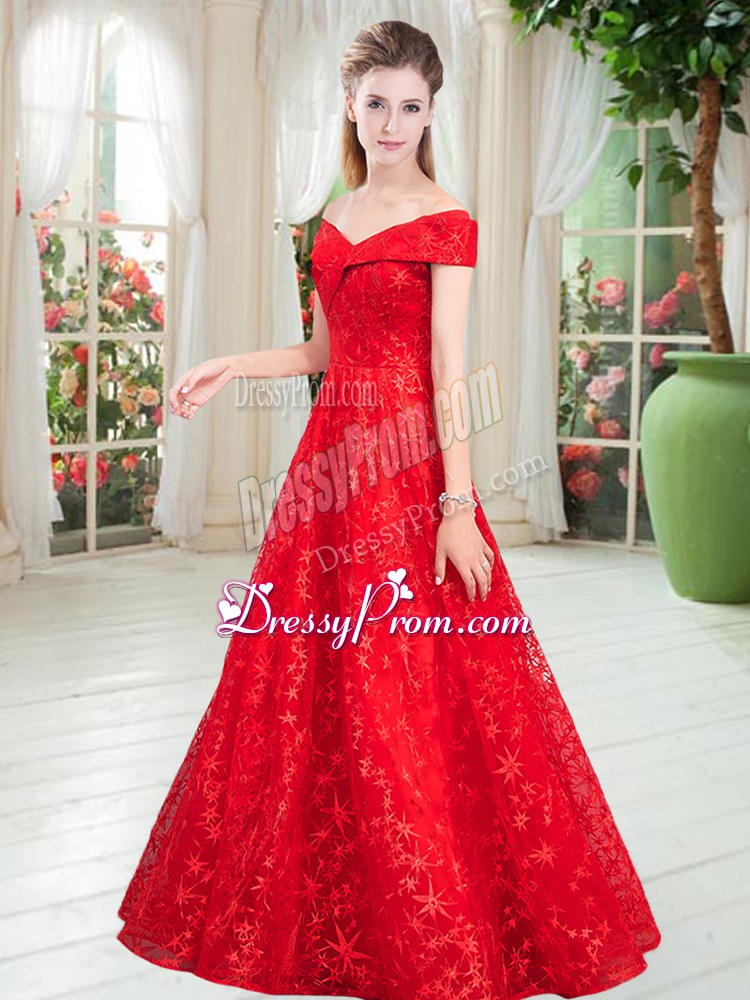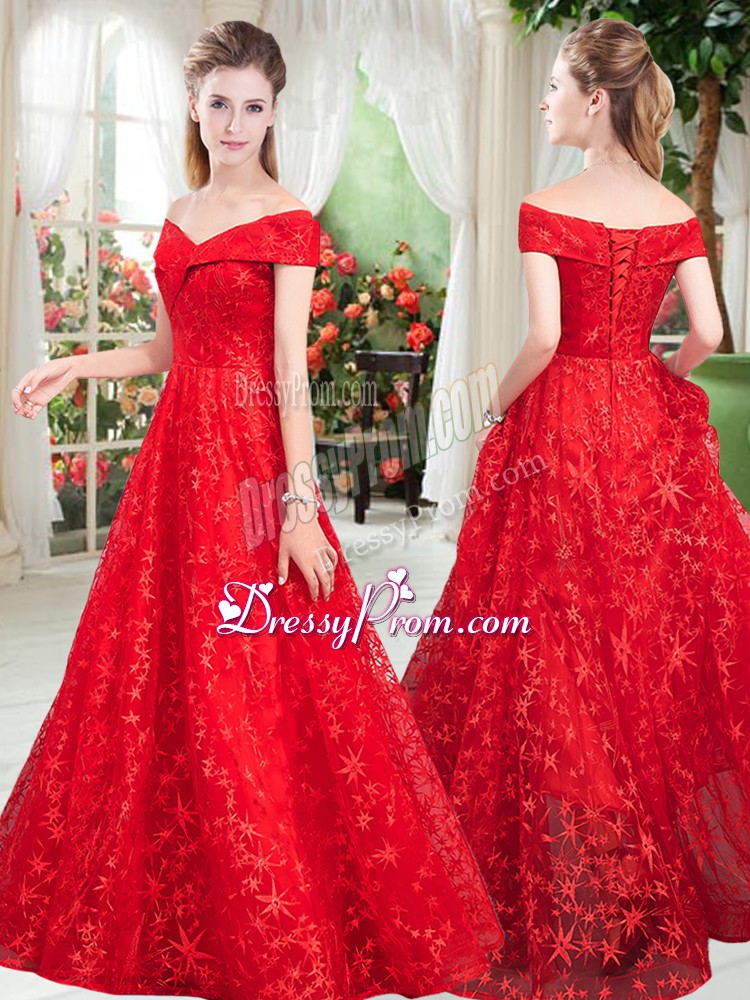 Neckline : Off the shoulderShown Color : RedSilhouette : A-lineSleeve Length : sleevelessHemline : floor lengthBack Detail : Lace upFabric : LaceEmbellishment : BeadingOccasion : Prom,PartySeason : Spring,Summer,Fall,Winter