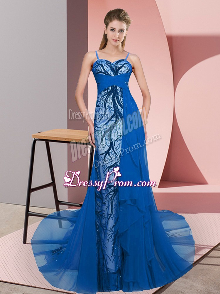 Neckline : Spaghetti strapsShown Color : BlueSilhouette : Column/SheathSleeve Length : sleevelessBack Detail : ZipperFabric : TulleEmbellishment : Beading,LaceOccasion : Prom,PartySeason : Spring,Summer,Fall,Winter