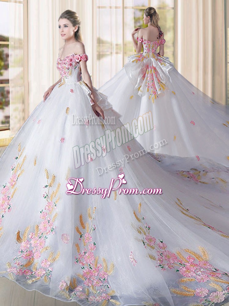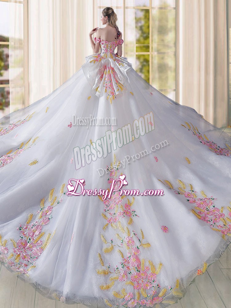 Super White Lace Up Off The Shoulder Appliques Quinceanera Dresses Tulle Sleeveless Cathedral Train