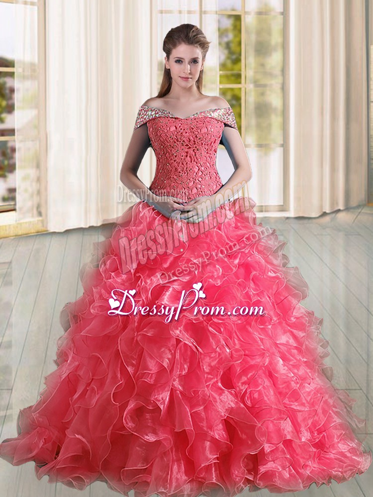 Neckline : Off the shoulder Shown Color : Coral Red Silhouette : A-line Sleeve Length : sleeveless Back Detail : Lace up Fabric : Organza Embellishment : Beading,Lace,Ruffles Occasion : Military Ball,Sweet 16,Quinceanera Season : Spring,Summer,Fall,Winter