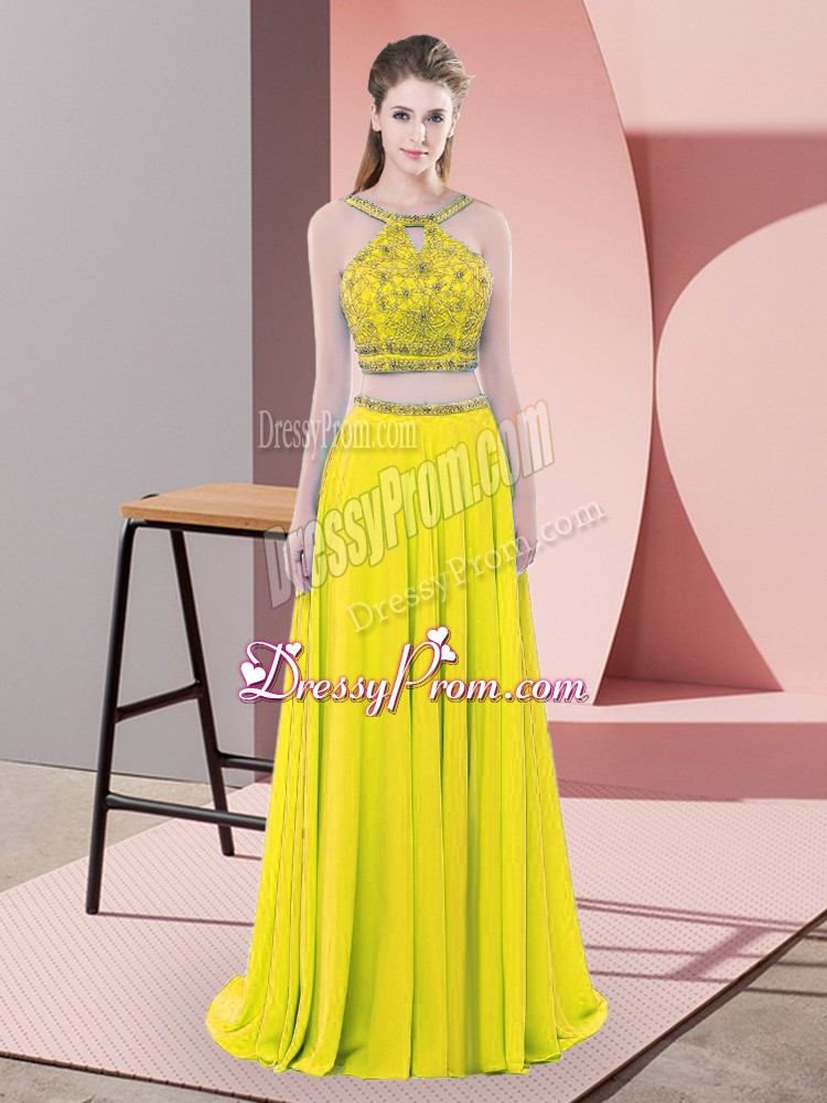 Neckline : StrapsShown Color : YellowSilhouette : Two PiecesSleeve Length : sleevelessBack Detail : BacklessFabric : ChiffonEmbellishment : BeadingOccasion : Prom,PartySeason : Spring,Summer,Fall,Winter