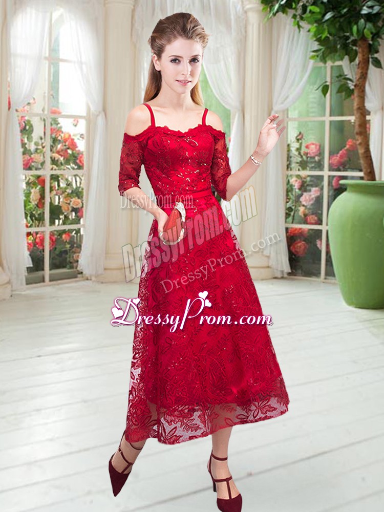 Neckline : Spaghetti strapsShown Color : RedSilhouette : A-lineSleeve Length : half sleevesHemline : tea lengthBack Detail : ZipperEmbellishment : LaceOccasion : Prom,PartySeason : Spring,Summer,Fall,Winter