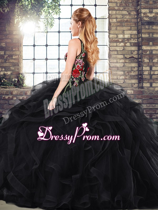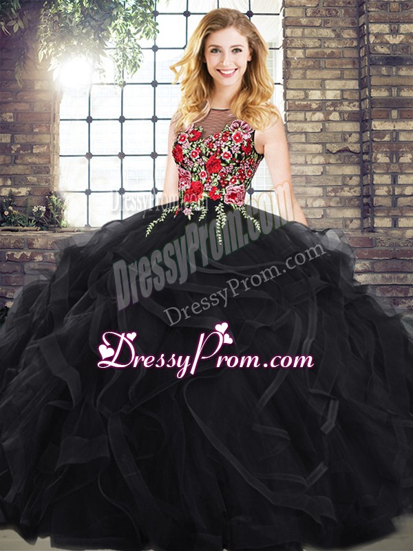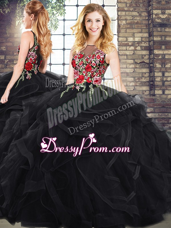 Neckline : ScoopShown Color : BlackSilhouette : Ball GownsSleeve Length : sleevelessBack Detail : ZipperEmbellishment : Embroidery,RufflesOccasion : Military Ball,Sweet 16,QuinceaneraSeason : Spring,Summer,Fall,Winter