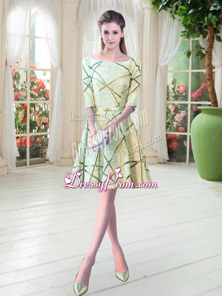 Neckline : ScoopShown Color : Yellow GreenSilhouette : A-lineSleeve Length : half sleevesHemline : knee lengthBack Detail : Lace upEmbellishment : RuchingOccasion : Prom,PartySeason : Spring,Summer,Fall