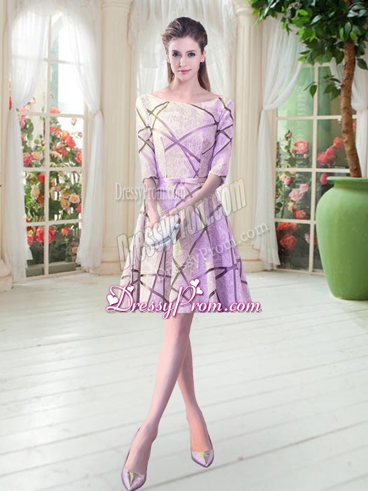 Neckline : ScoopShown Color : LilacSilhouette : A-lineSleeve Length : half sleevesHemline : knee lengthBack Detail : Lace upEmbellishment : RuchingOccasion : Prom,PartySeason : Spring,Summer,Fall