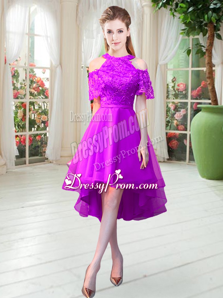 Neckline : High-neckShown Color : PurpleSilhouette : A-lineSleeve Length : short sleevesHemline : high lowBack Detail : ZipperFabric : TulleEmbellishment : LaceOccasion : Prom,PartySeason : Spring,Summer,Fall