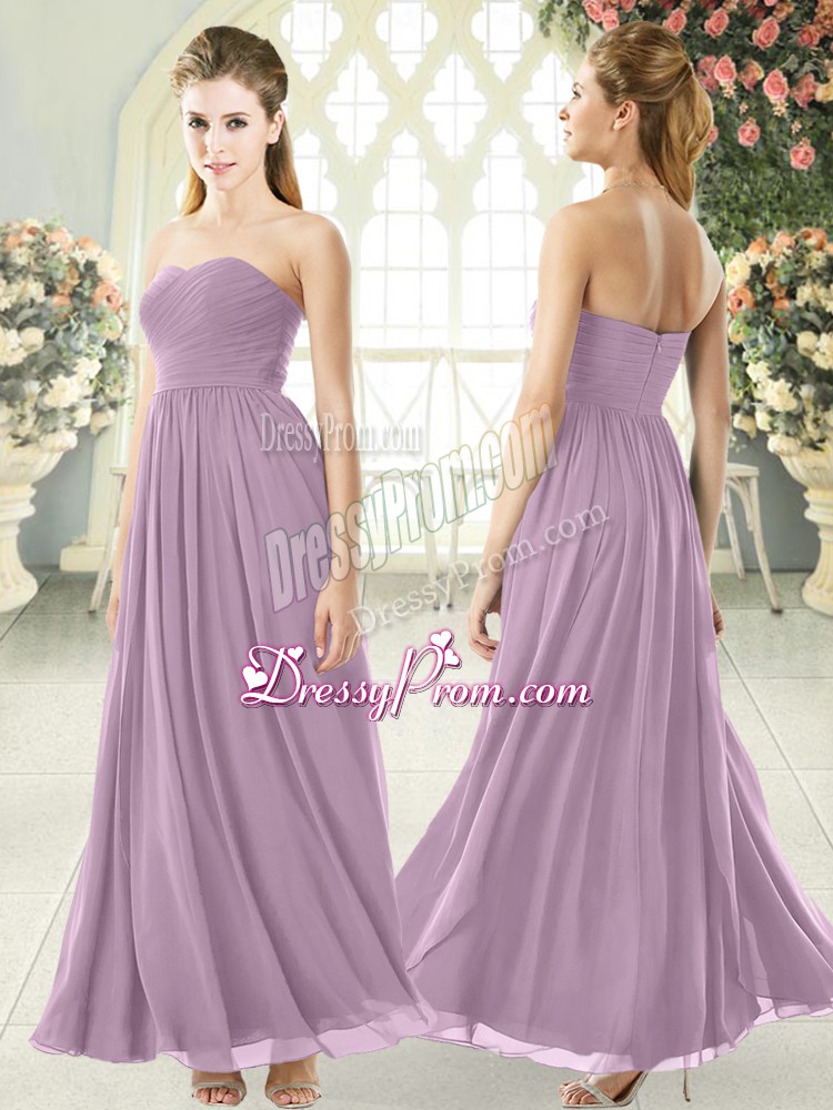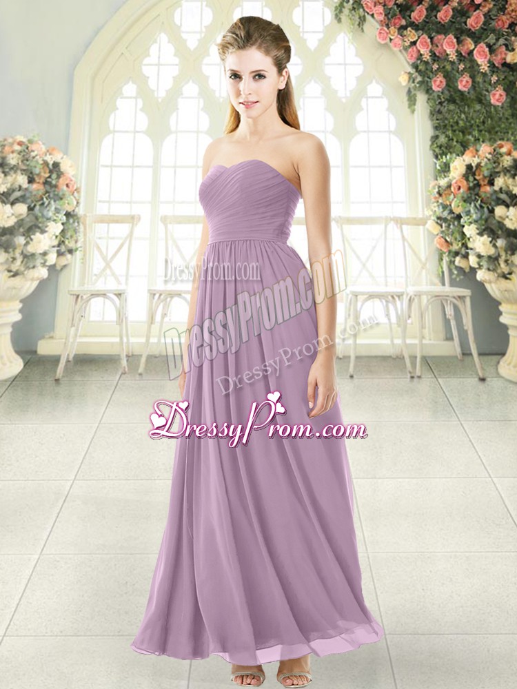 Neckline : StraplessShown Color : PurpleSilhouette : EmpireSleeve Length : sleevelessHemline : ankle lengthBack Detail : ZipperFabric : ChiffonEmbellishment : RuchingOccasion : Prom,PartySeason : Spring,Summer,Fall,Winter