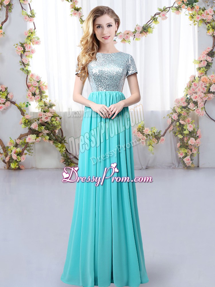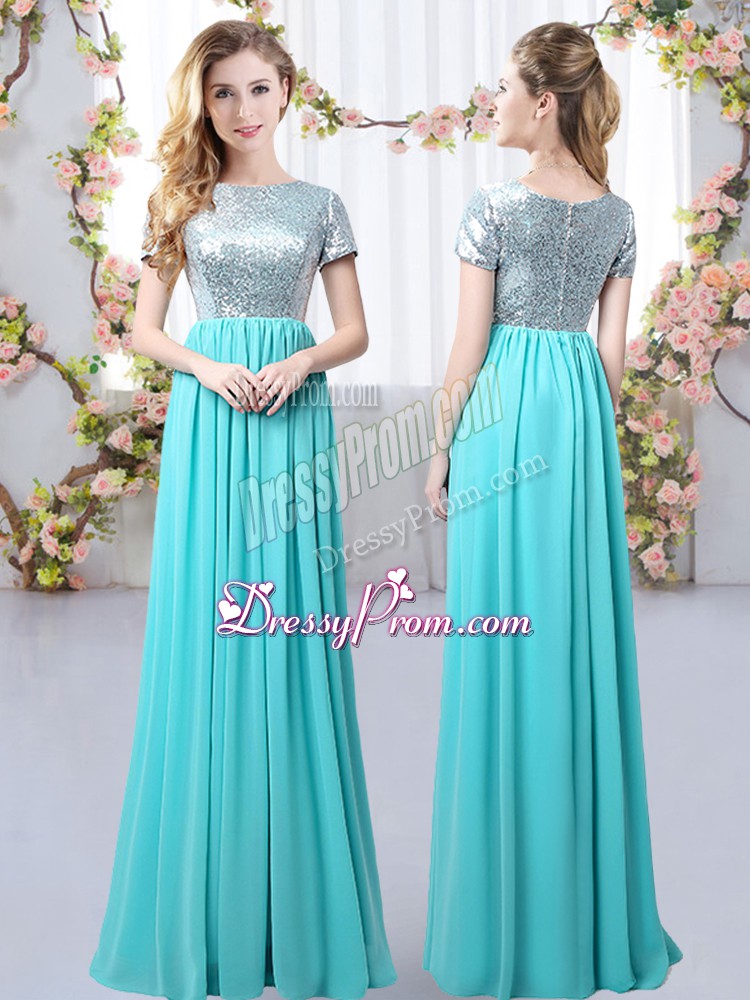 Neckline : ScoopShown Color : Aqua BlueSilhouette : EmpireSleeve Length : short sleevesHemline : floor lengthBack Detail : ZipperFabric : ChiffonEmbellishment : SequinsOccasion : Prom,Party,Wedding PartySeason : Spring,Summer,Fall,Winter