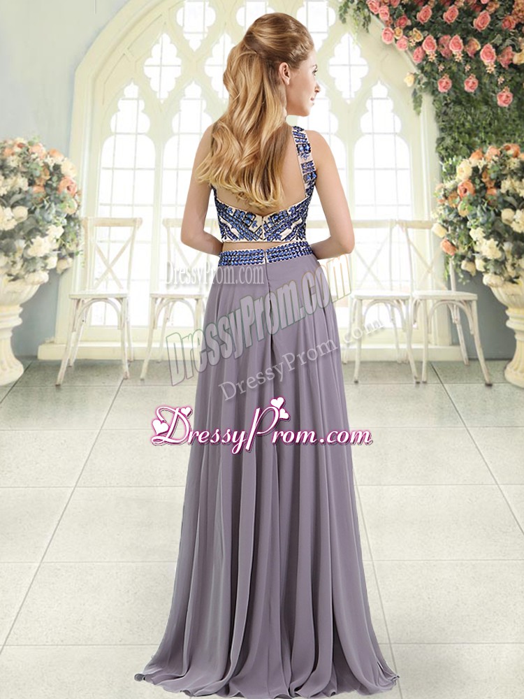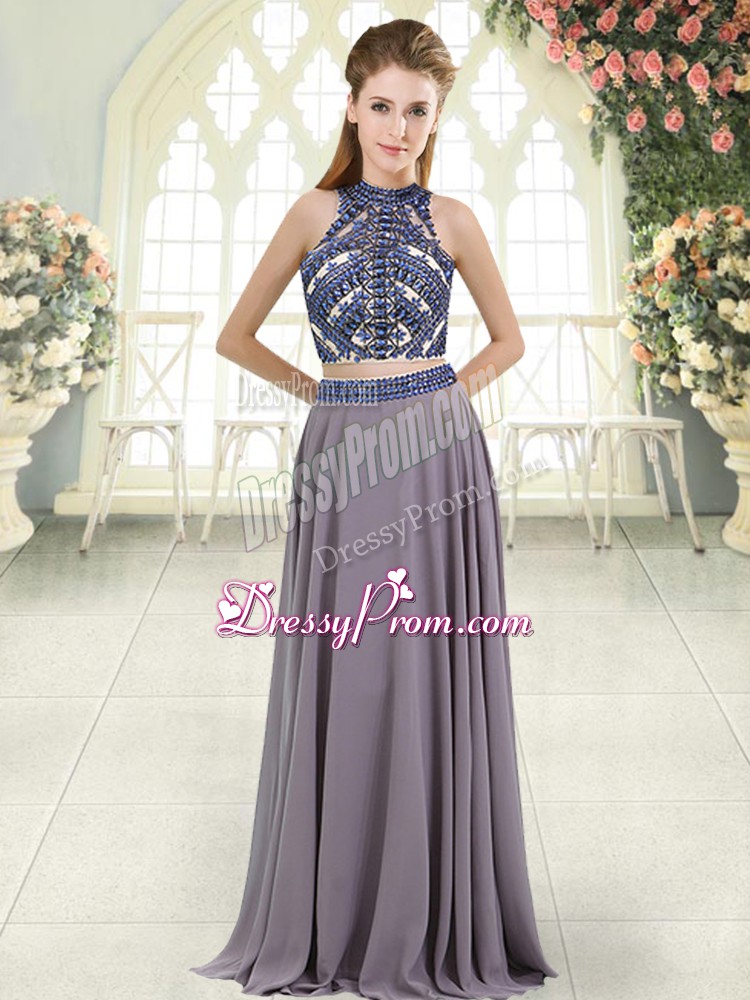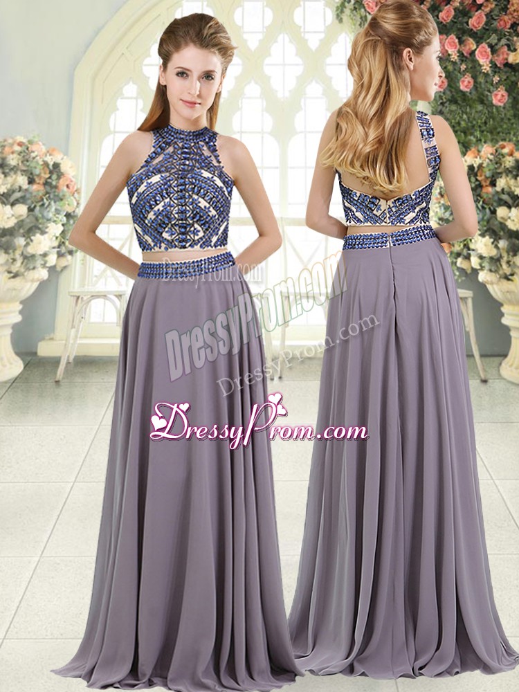 Neckline : High-neckShown Color : GreySilhouette : Two PiecesSleeve Length : sleevelessHemline : floor lengthBack Detail : BacklessFabric : ChiffonEmbellishment : BeadingOccasion : Prom,PartySeason : Spring,Summer,Fall,Winter