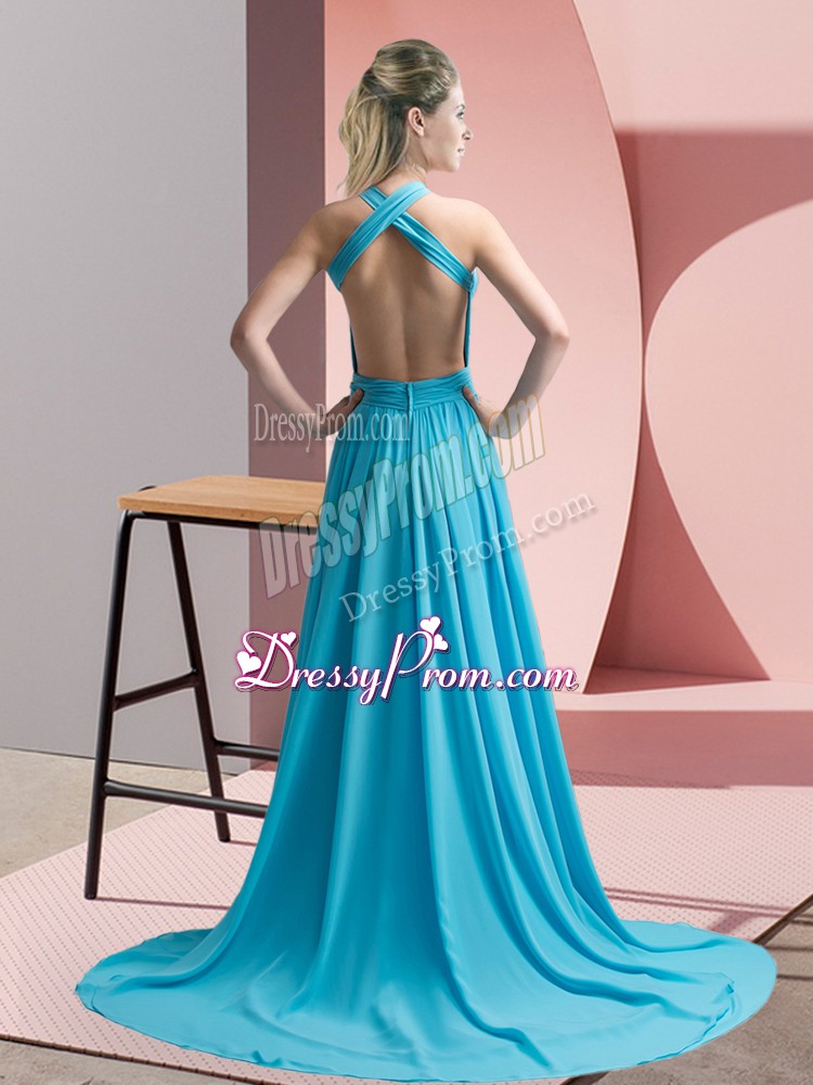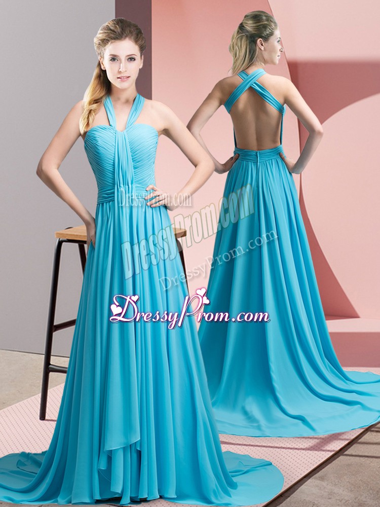 Neckline : Halter topShown Color : Aqua BlueSilhouette : EmpireSleeve Length : sleevelessBack Detail : BacklessFabric : ChiffonEmbellishment : Beading,RuchingOccasion : Prom,Party,Military BallSeason : Spring,Summer,Fall,Winter