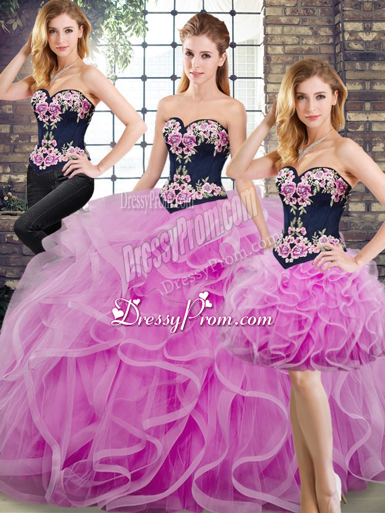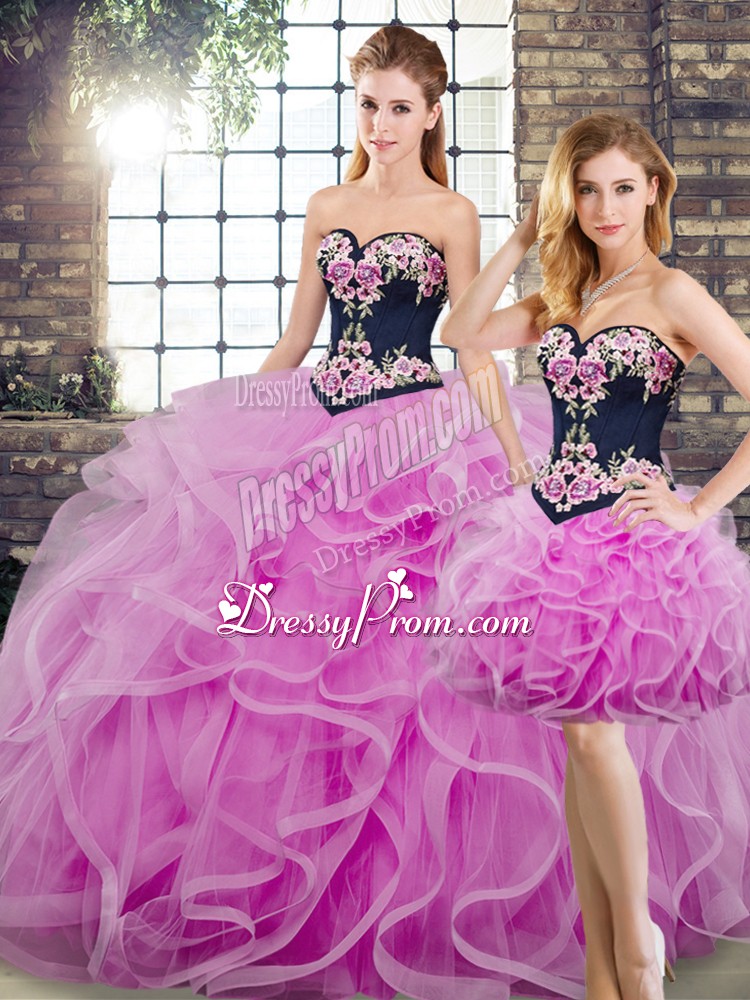 Neckline : SweetheartShown Color : LilacSilhouette : Ball GownsSleeve Length : sleevelessBack Detail : Lace upFabric : TulleEmbellishment : Beading,Embroidery,RufflesOccasion : Military Ball,Sweet 16,QuinceaneraSeason : Spring,Summer,Fall,Winter